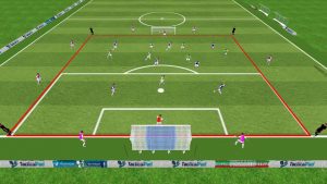 Hoy os traemos un ejemplo práctico del ejercicio de partido reducido 7×7 con 7 apoyos externos. En él buscaremos generar situaciones de finalización mediante superioridad numérica. El equipo en posesión del balón podrá apoyarse en los comodines exteriores para buscar amplitud y en los del fondo para conseguir profundidad.